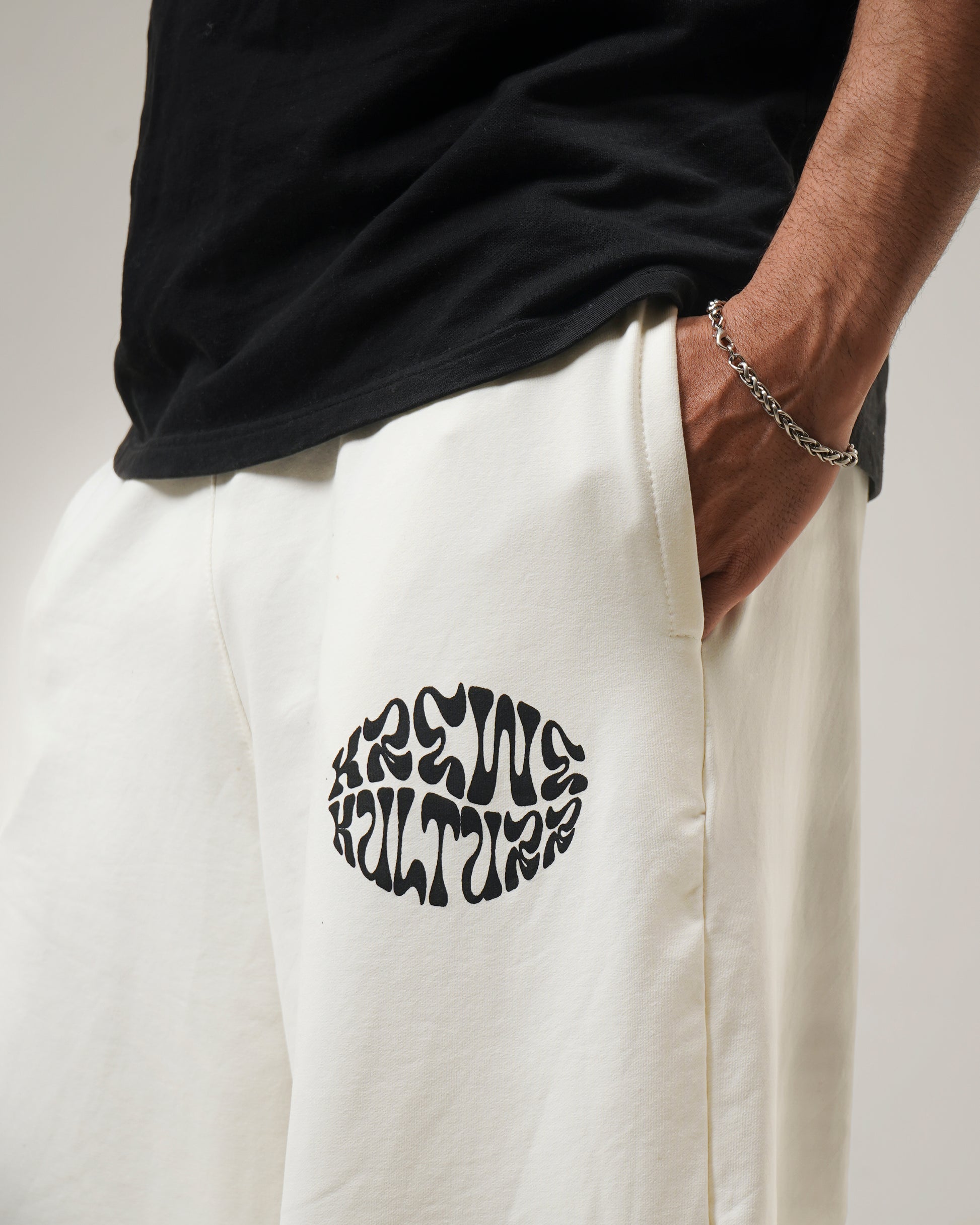 Bold meets clean in these statement lowers designed to stand out without trying too hard. The crisp white base keeps the look fresh, while the strong black side panel adds a sharp athletic edge. Graphic placements bring in that fearless energy, giving the piece a streetwear attitude with a premium finish. Cut in a relaxed straight fit with an elastic waistband for all-day comfort, these lowers are made to move with you while keeping your style locked in. Easy to pair, impossible to miss.